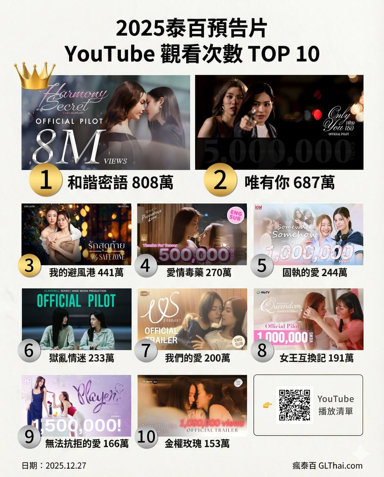 - 【2025泰百回顧 3 】預告片YouTube觀看次數排行榜:冠軍《Harmony Secret》808萬,話題度拉滿!