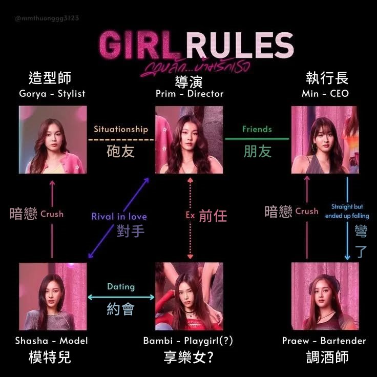 《Girl Rules》是百合劇迷今年最期待的作品之一,MilkLove、NamtanFilm、ViewMim的三對CP大亂燉,在上流派對中相互曖昧。預告片中,Namtam居然壞壞地跟Love說「我吻妳之後,我們還能夠繼續一起工作,對吧?」,然後Love高冷地回答「你知道,我是專業的。」然後兩人就作勢要接吻。