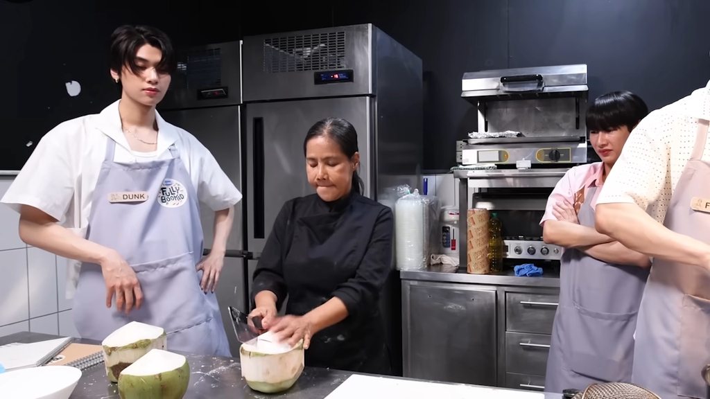 從怎麼揉出那個紫色小湯圓開始,搞到藝人快吐血,讓我印象深刻5555。有趣的是泰國人在做這道湯圓揉麵糰時就會加入椰奶,這也讓口感和台式小湯圓不會一樣w,另外也加入現切椰肉,現場菜刀殺椰子,砍砍砍好療癒(喂