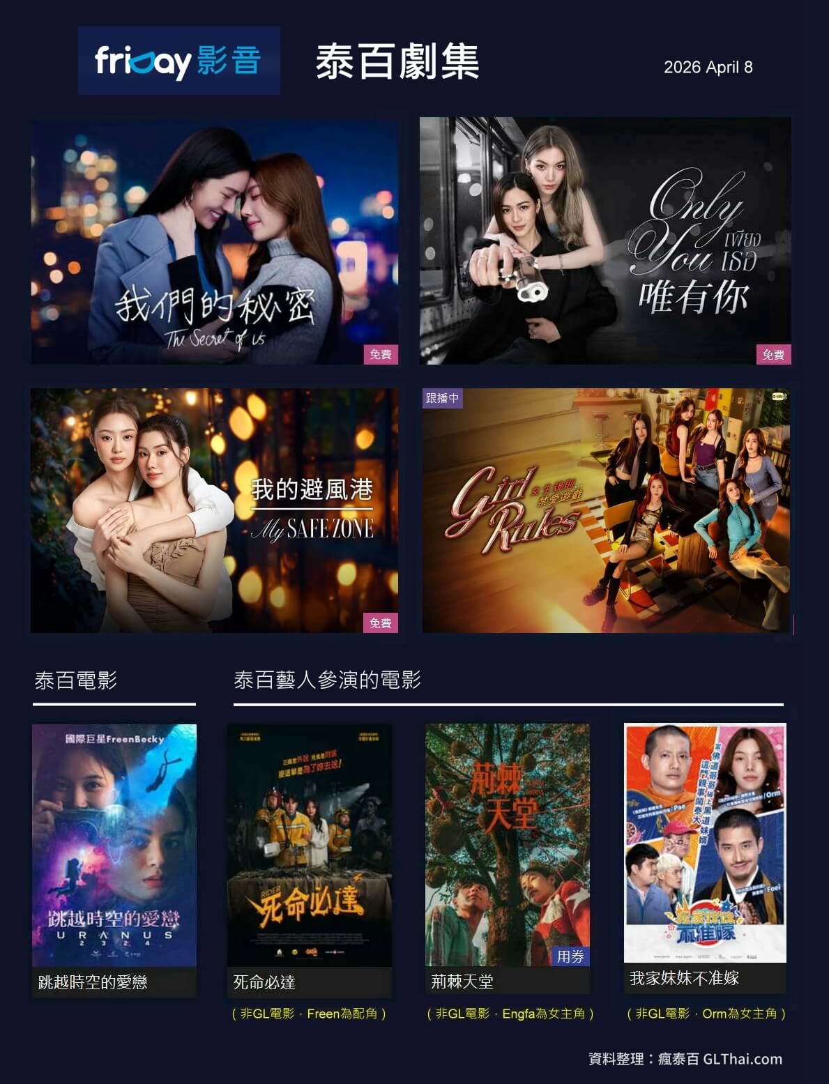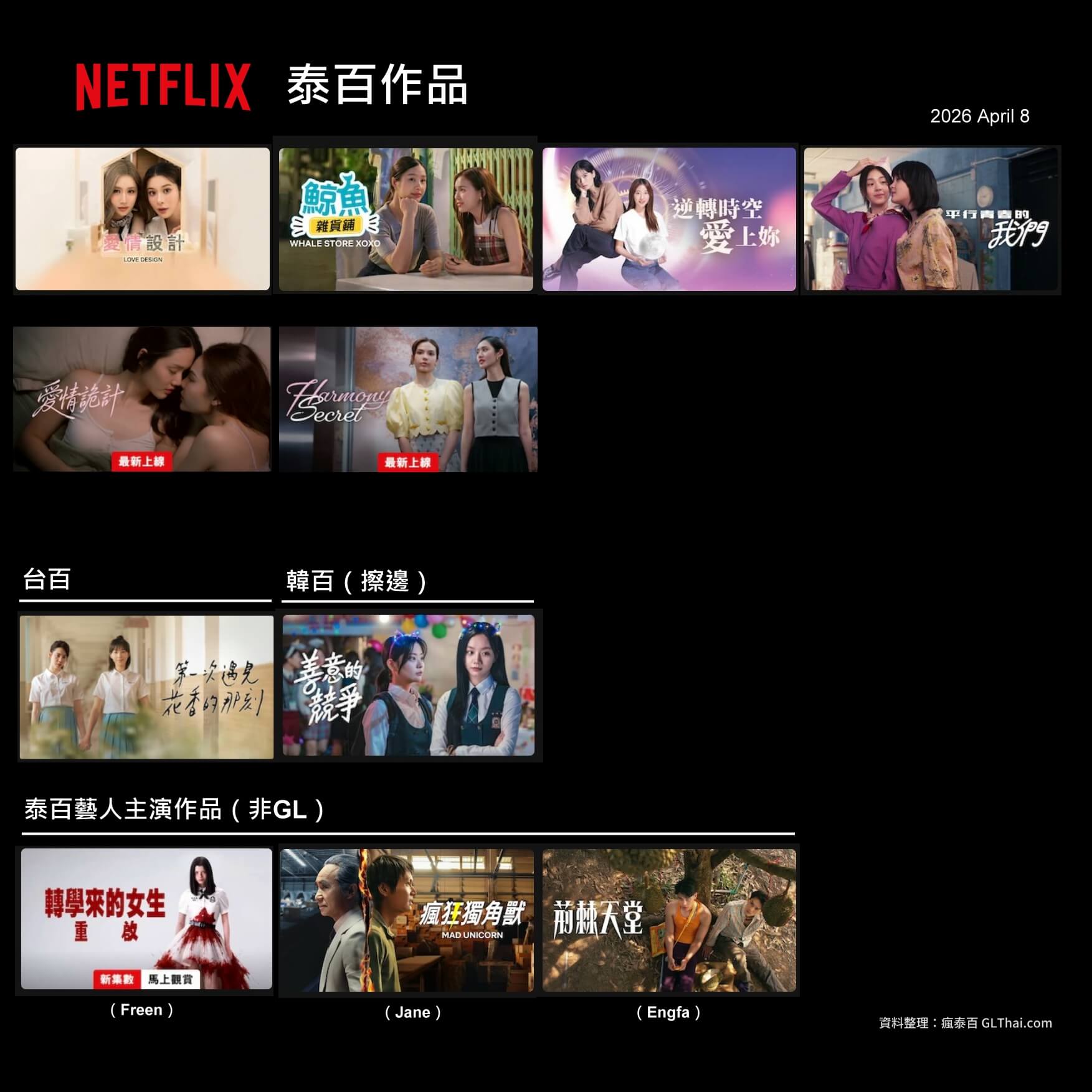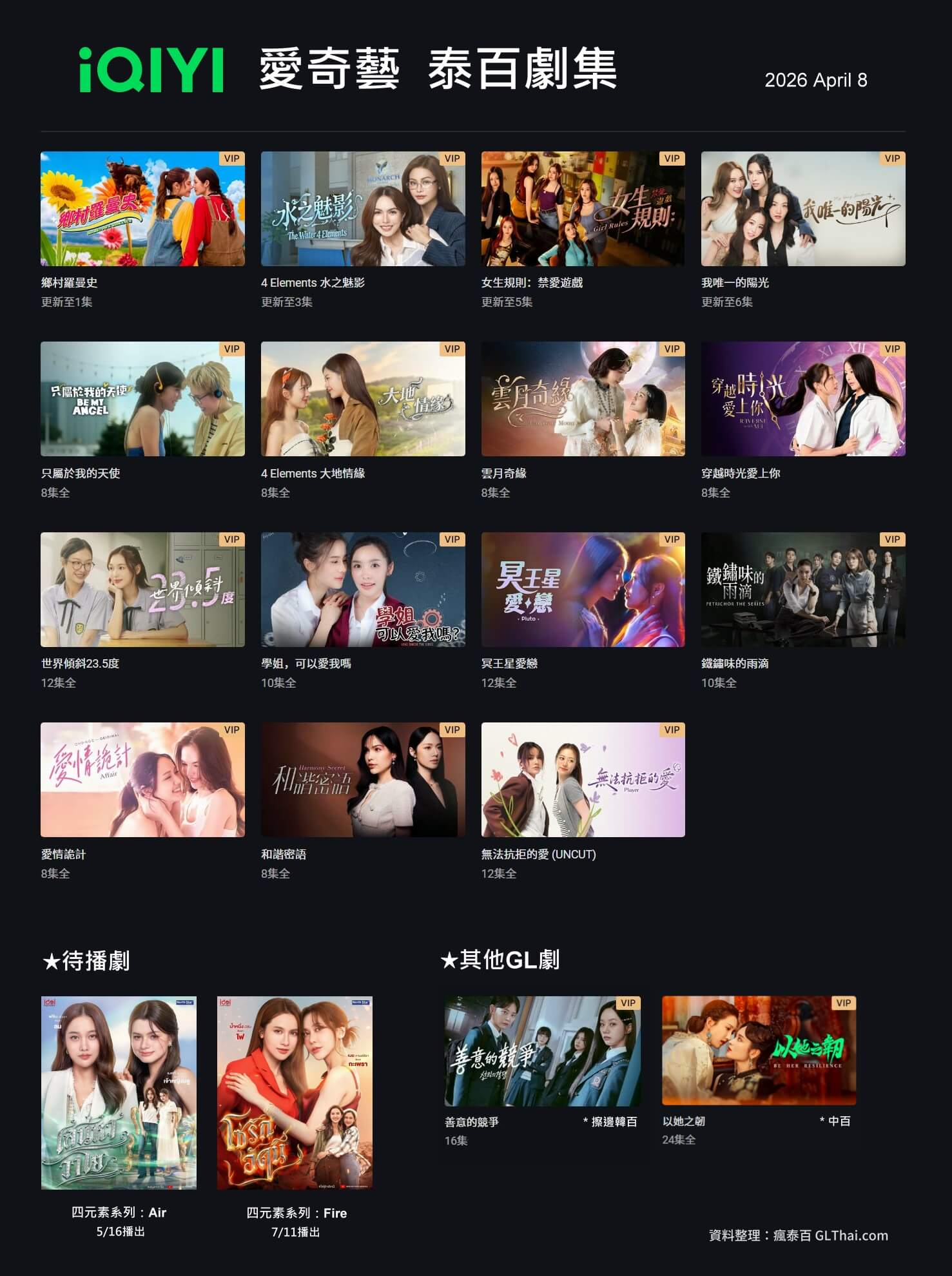 截至2026年4月8日,愛奇藝一共有15齣泰百劇集可以觀看,外加一個擦邊GL的超好看韓劇《善意的競爭》,以及中百《以她之韌》。