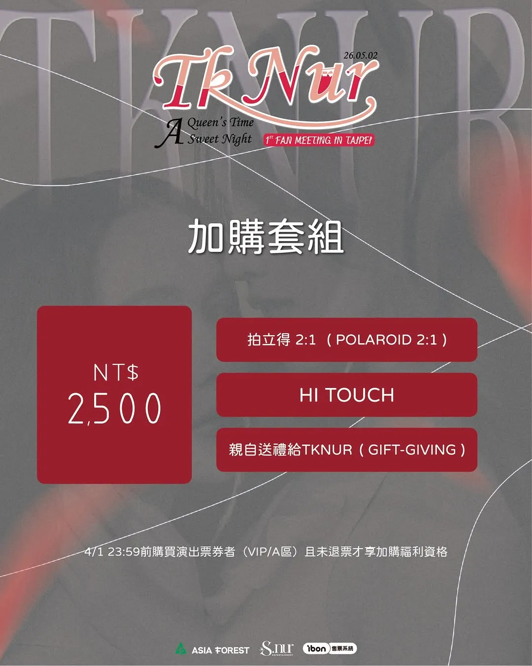 1. 4/1 23:59前購買演出票券者(VIP/A區)享加購福利資格。